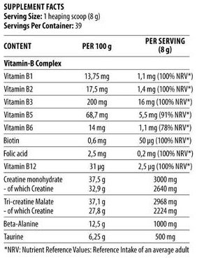 Ono što ovaj preparat izdvaja od običnih kreatina je sinergija ključnih sastojaka. Dodavanjem precizne doze Beta-alanina i Taurina, uz esencijalne vitamine, postignut je efekat koji direktno smanjuje umor i pojačava delovanje kreatina.